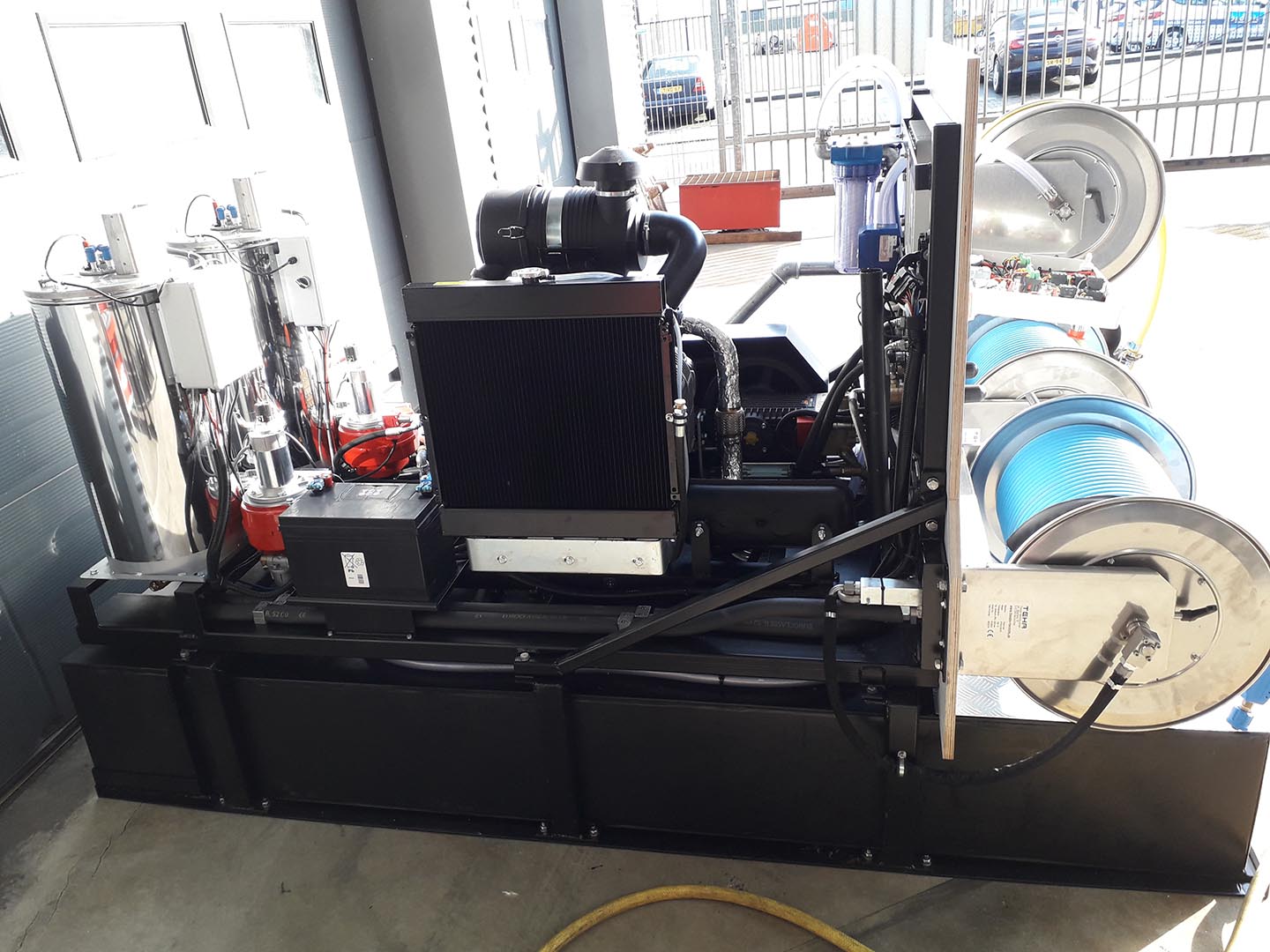Lisävarusteena mm. 500 bar ruostumaton letkukela (n. 60 m 3/8″ letkua), 50 m 500 bar korkeapaineletku ja HDPE-polttoainesäiliö n. 80 l teräskannella ja lukolla